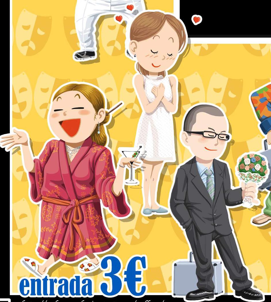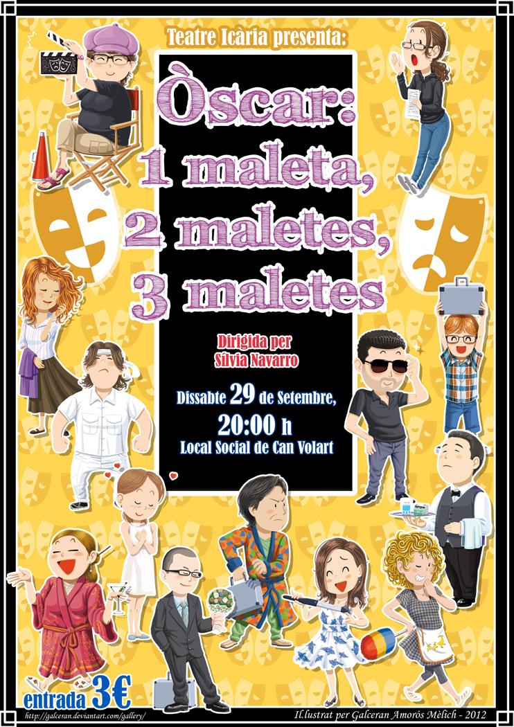 Cartell realitzat pel grup de teatre Icària, al 2012, per l'obra "Òscar: 1 maleta, 2 maletes, 3 maletes".