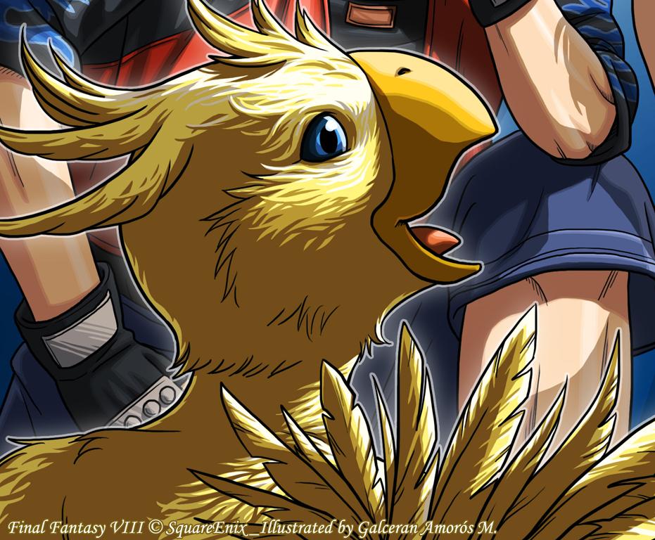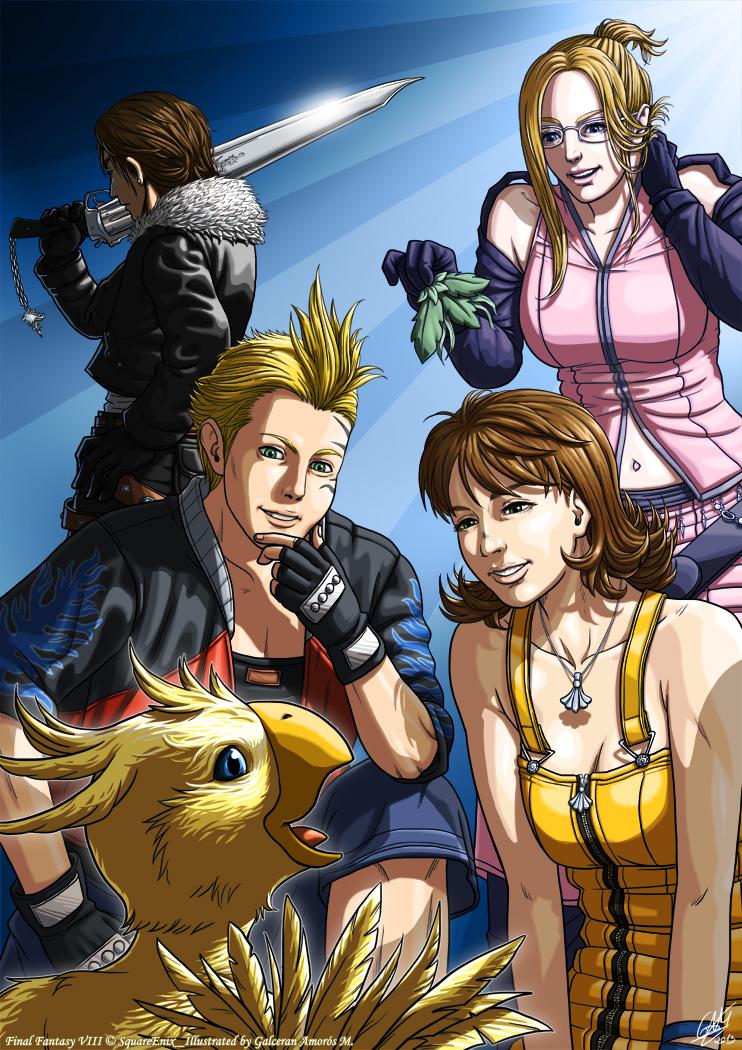 Squall, Quistis, Zell, Selphie i un petit Chocobo.