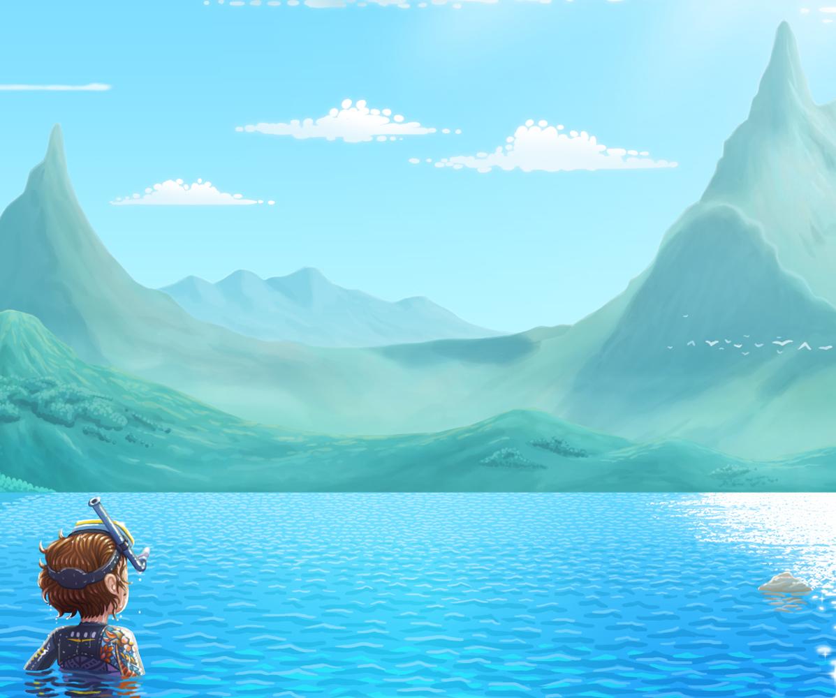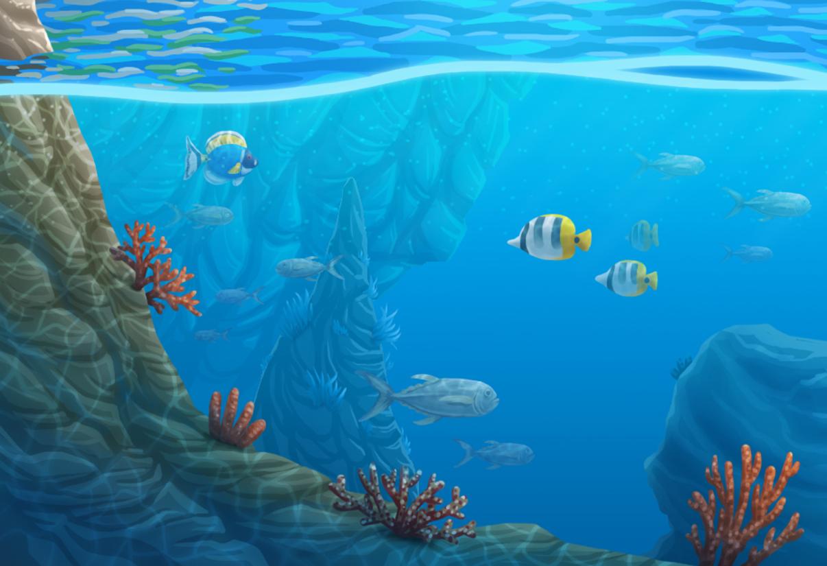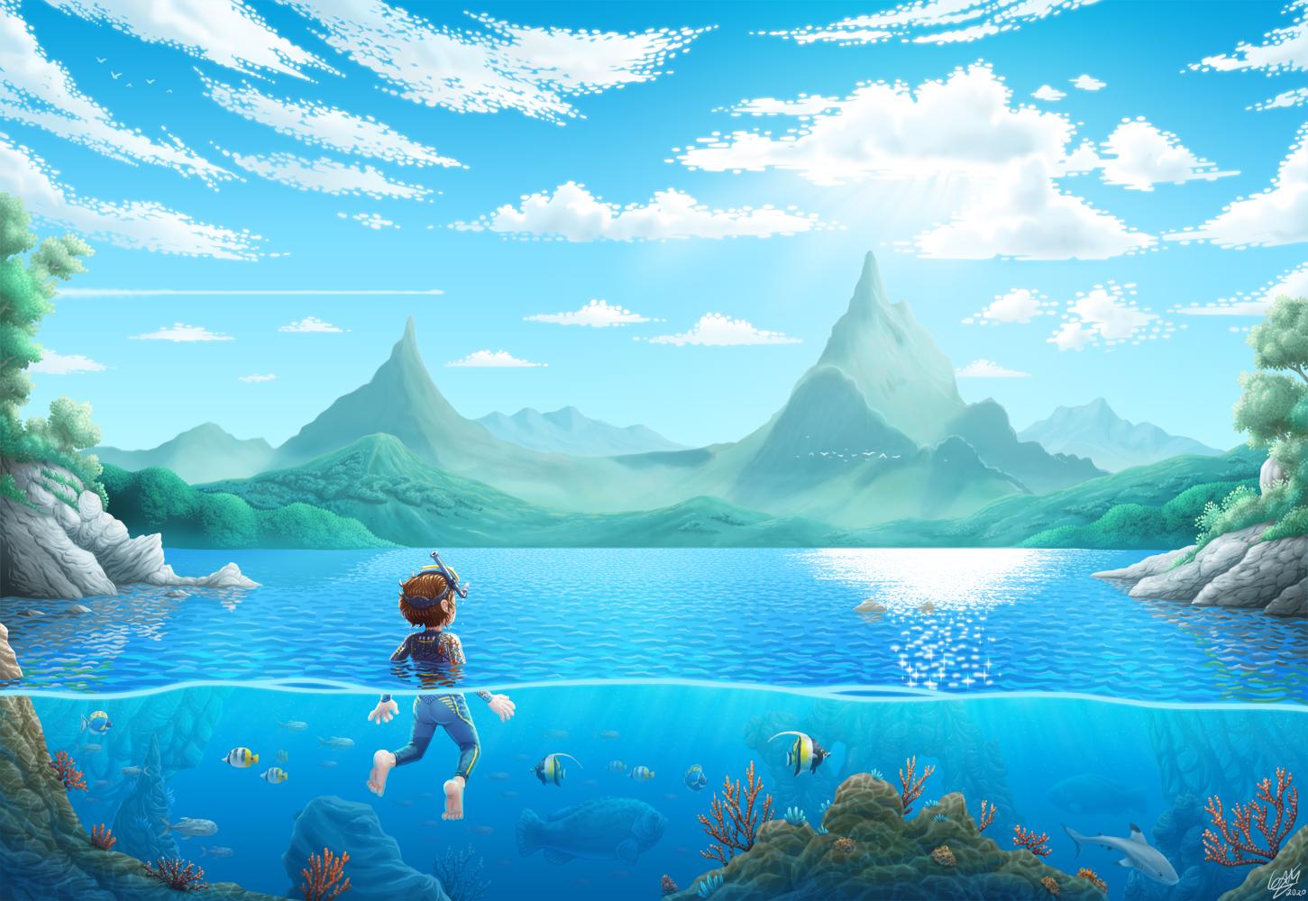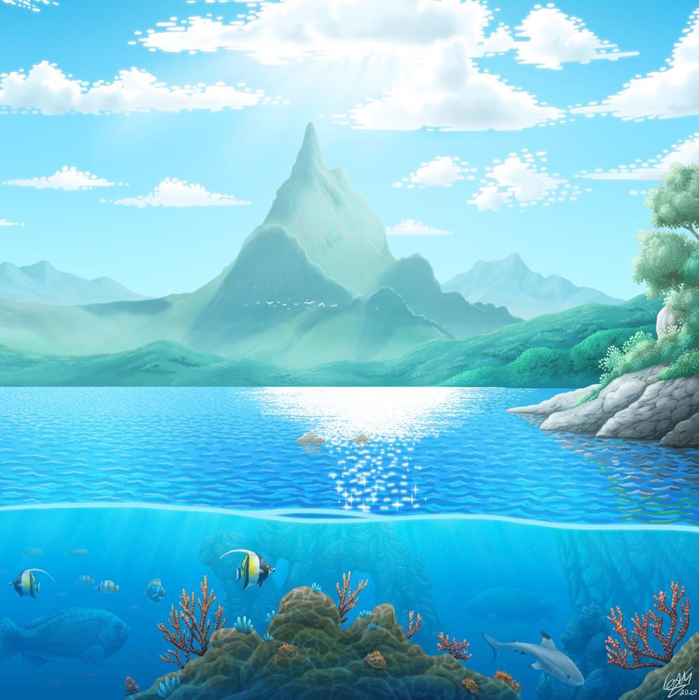 Il·lustració feta l'any 2020 per practicar la llunyania reflexos de l'aigua i el fons marí.