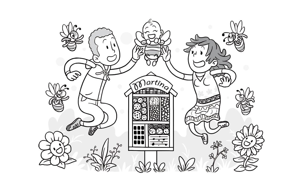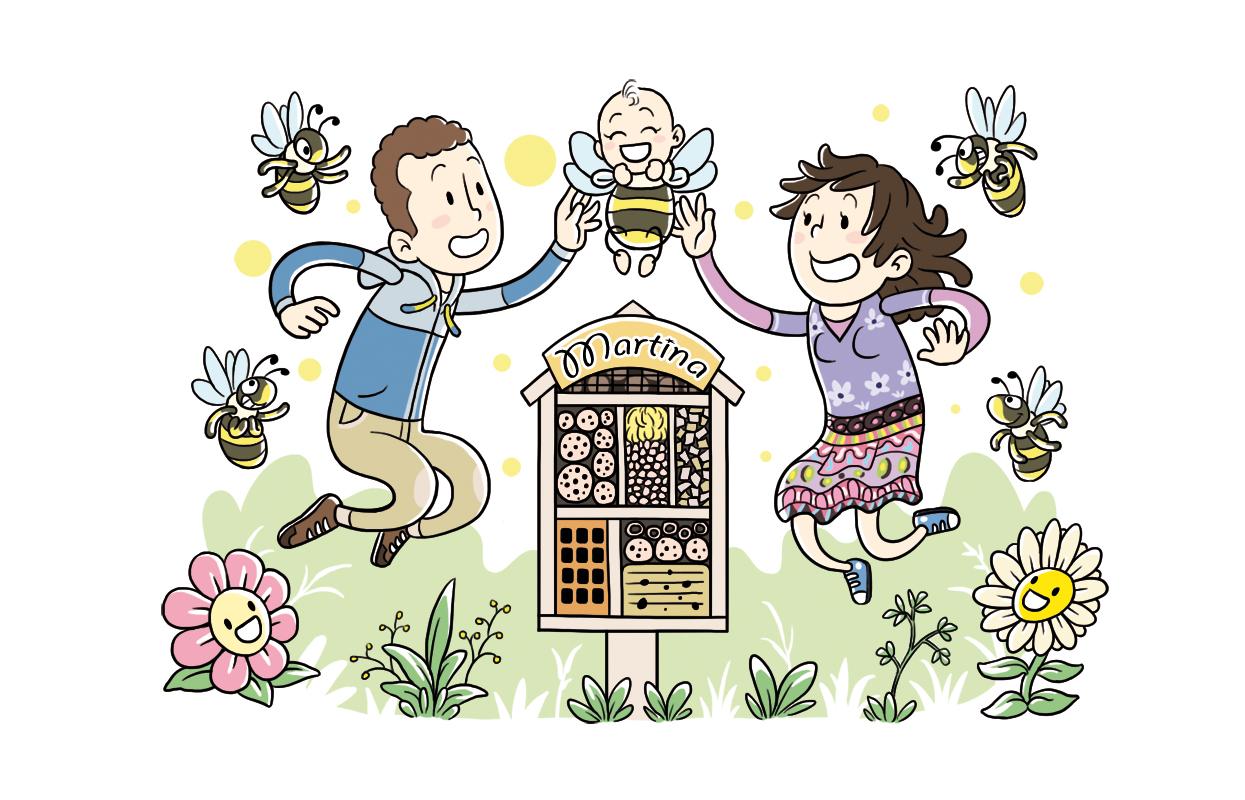 Encàrrec de 2016 per a crear una sèrie de cinc imatges per a reproduir-les en unes rajoles, com si fos una auca (a color) i per a unes tasses (en blanc i negre). Els personatges són una parella que espera una criatura i la idea era de representar-los en diferents escenes en algunes de les aficions que tenen.