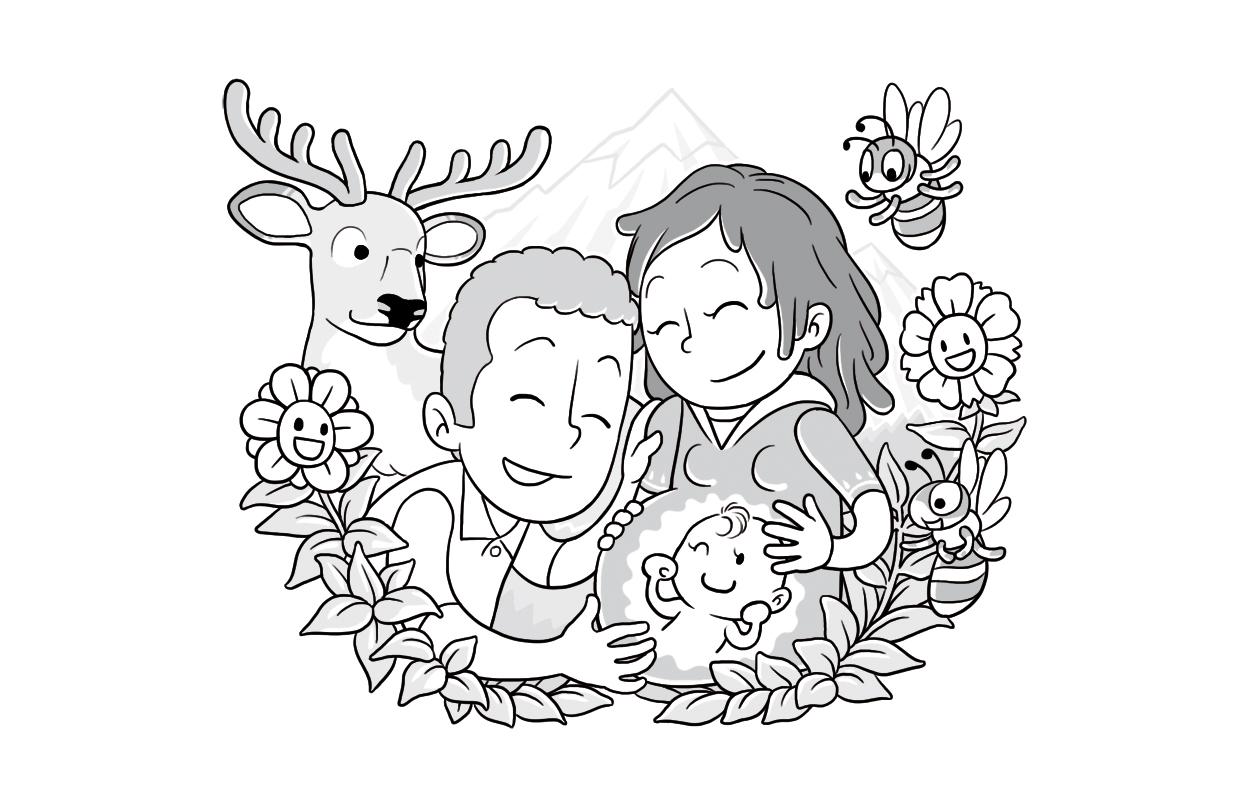 Encàrrec de 2016 per a crear una sèrie de cinc imatges per a reproduir-les en unes rajoles, com si fos una auca (a color) i per a unes tasses (en blanc i negre). Els personatges són una parella que espera una criatura i la idea era de representar-los en diferents escenes en algunes de les aficions que tenen.