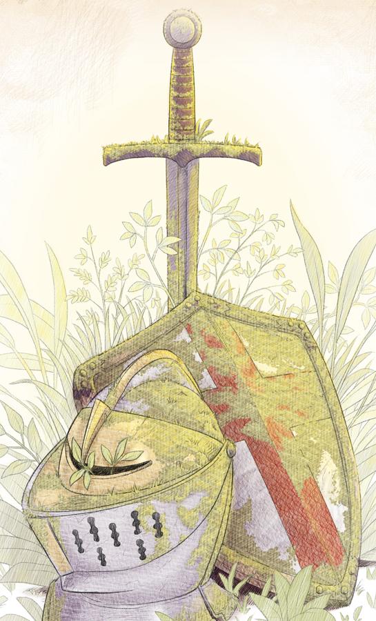 Sant Jordi rosa rose escut escudo shield espasa espada sword casc casco helmet